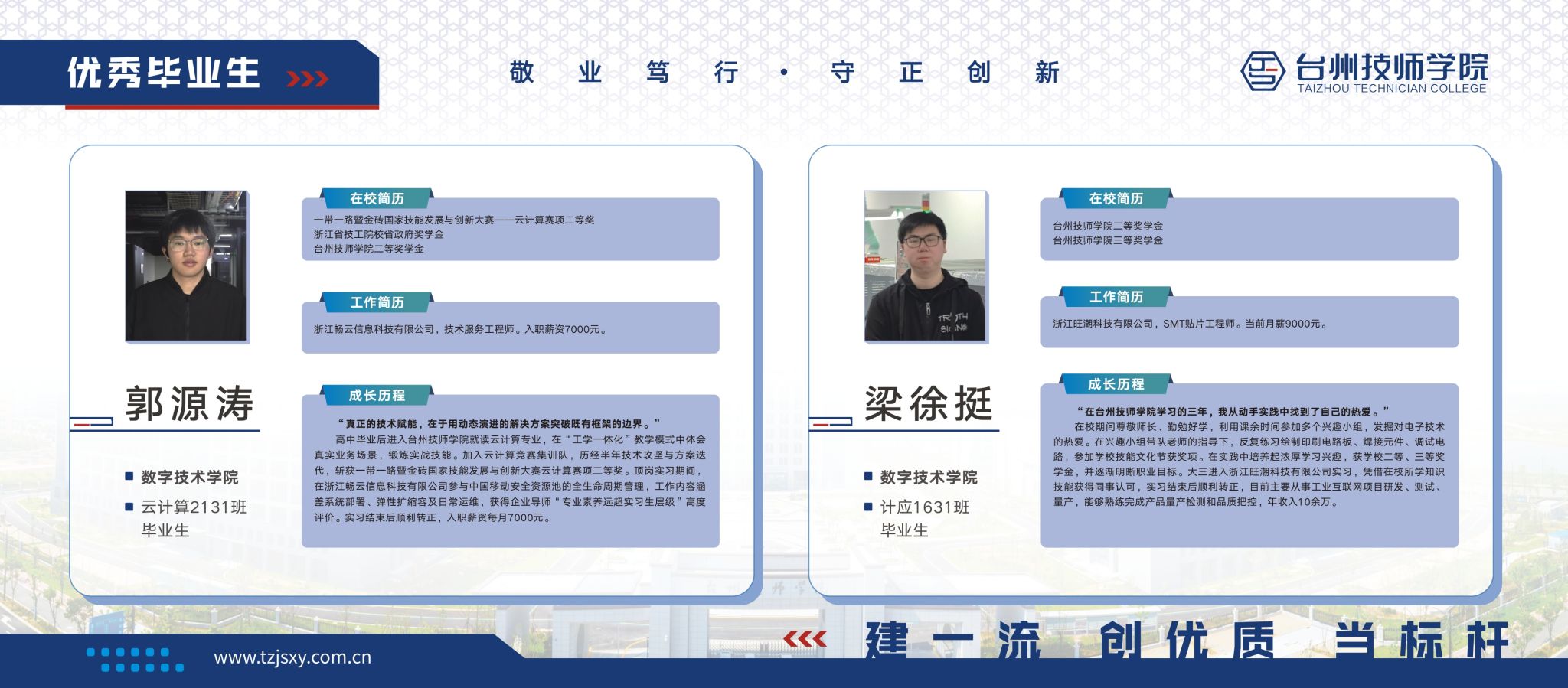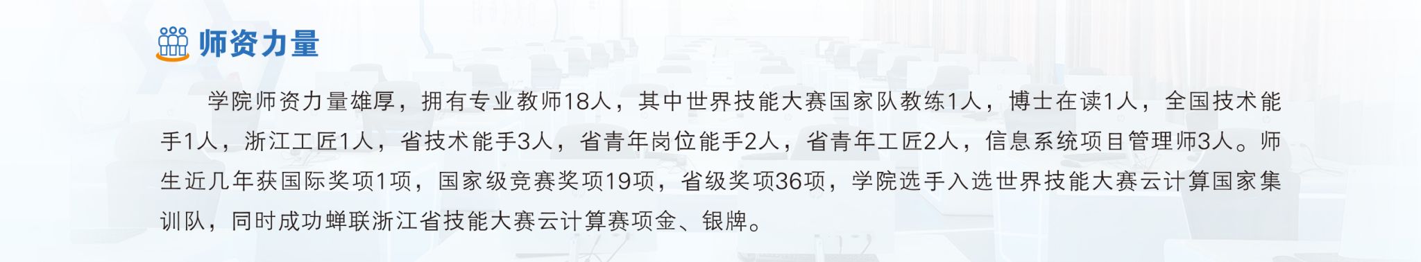 4.办学成果:专业师资力量雄厚,拥有全国技师能手1名,浙江省技术能手2名,浙江省青年岗位能手2人,浙江省青年工匠2人,技师以上3人,博士在读1人。科研成果丰厚,师生累计发表专业论文30余篇,其中核心期刊2篇,拥有专利或软著18项,主持或参与课题22项,其中市厅级及以上课题7项。竞赛成绩斐然,师生参与各类竞赛获得国家级奖项6人/次,获得省市级奖项18人/次。我院选手在第45、46届世界技能大赛云计算项目浙江省选拔赛中分别获得第三名和第二名的好成绩,在第47届世界技能大赛云计算项目浙江省选拔赛中老师和学生分别包揽第一和第二名,第二届全国职业技能大赛云计算项目第四名的成绩,刷新了浙江省该项目最好成绩,并且进入到了47届世界技能大赛云计算项目的国家集训队。