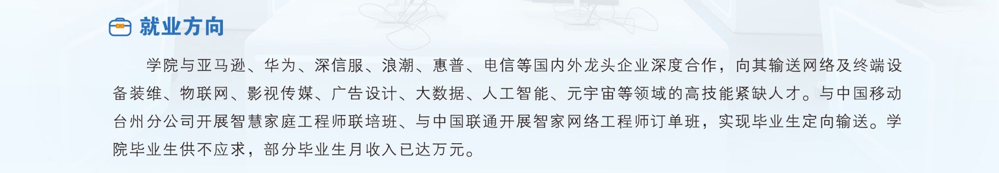 2.主要课程:Python程序设计、网络设备配置管理、网络数据库、云计算系统管理(Linux)、云计算基础架构平台应用、虚拟化技术与应用、IT产品营销、响应式网页设计、PHP程序设计、图形图像处理、流程图设计(Visio) 、小型局域网组建与管理、小程序开发实训、高可用集群架构实训、云平台部署与管理实训(OpenStack)、网络安全实训、海量并发Web平台架构实战等课程。
