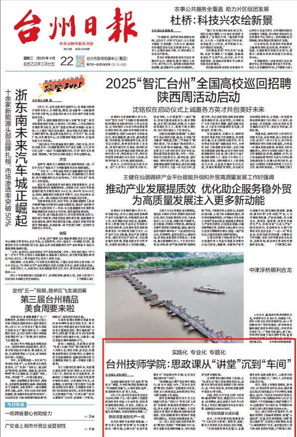 邀请《风起大陈》舞剧进校园展演,开办“我心向党 技能报国”沉浸式青春思政课,组织“有技青年宣讲团”入企进村宣讲,开展“螺丝钉先锋队”假期社会实践,台州技师学院思政课冒热气、接地气、有人气。台州技师学院创新构建“车间思政接地气、云端课堂拓边界、垦荒精神铸灵魂”育人体系,把思想政治教育有机融入专业课程,实现思政课程的实践化、专业化、专题化,在“三全育人”体系中实现知识传授筑基、能力培养强技、价值引领铸魂的统一。...