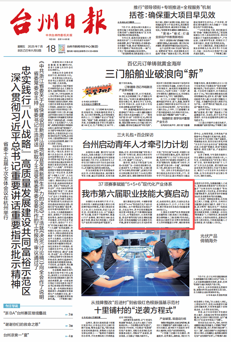 7月17日,台州市第六届职业技能大赛在台州技师学院拉开帷幕。本届大赛由市委人才办、市人力社保局、市总工会、团市委、市妇联联合主办,以“技赢台州”为主题,设置37个竞赛项目,覆盖12个产业领域,预计吸引2000余名选手参赛,将成为台州技能人才培养与产业发展双向奔赴的“促进器”。 据大赛组委会介绍,本届赛事紧扣全市“5+5+6”特色现代化产业体系建设靶心,26个赛项直接对接重点产业,占比达70%,其中在精密制造领域设置9项竞赛。...