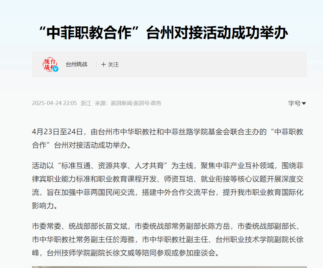 4月23日至24日,由台州市中华职教社和中菲丝路学院基金会联合主办的“中菲职教合作”台州对接活动成功举办。活动以“标准互通、资源共享、人才共育”为主线,聚焦中菲产业互补领域,围绕菲律宾职业能力标准和职业教育课程开发、师资互培、就业衔接等核心议题开展深度交流,旨在加强中菲两国民间交流,搭建中外合作交流平台,提升我市职业教育国际化影响力。市委常委、统战部部长苗文斌,市委统战部常务副部长陈方岳,市委统战部副部长、...