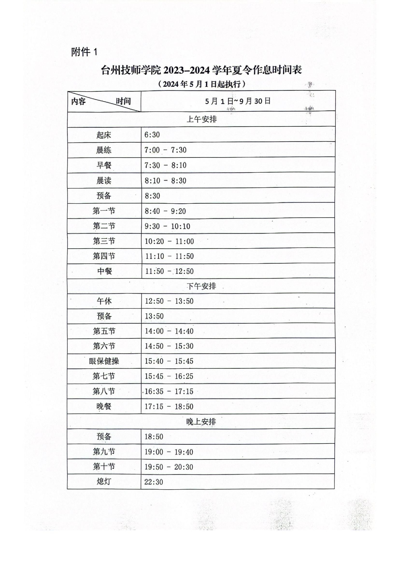 附件:1.台州技师学院2023-2024学年夏令作息时间表