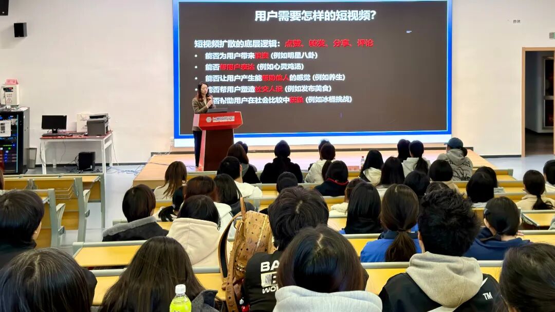 台州市新闻传媒中心全媒体第二集群广播事业部资讯部主管、台州市国际传播中心主管杨懿,以《从0到1!创意短视频创作及新媒体运营技巧》为主题,深入浅出地讲解了短视频创作与新媒体运营的实战技巧。她从“如何让台州元素成为流量密码”入手,揭秘爆款内容背后的逻辑,为同学们打开了新媒体创作的新视野。