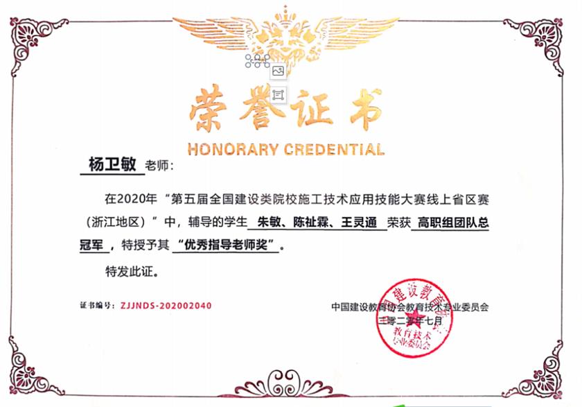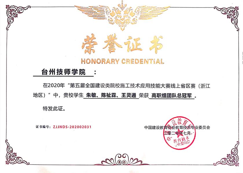 7月30日,中国建设教育协会教育技术专业委员主办的第五届全国建设类院校施工技术应用技能大赛线上省区赛顺利结束。学院建筑施工专业朱敏、王灵通、陈祉霖三位同学荣获 “高职组团队总冠军”,朱敏同学荣获“个人一等奖”,陈祉霖同学获“个人三等奖”,杨卫敏老师荣获“优秀指导老师奖”。