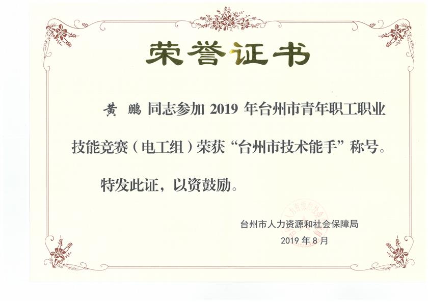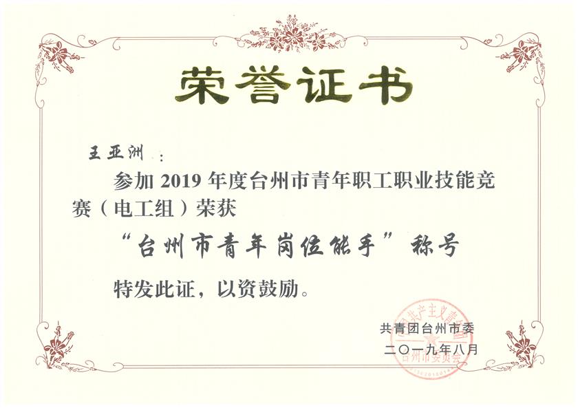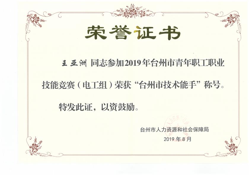 2019年7月12-13日,2019年台州市青年职工职业技能竞赛在台州职业技术学院拉开帷幕。我院刘华全老师获车工组第四名并获得“台州市青年岗位能手”称号、王亚洲老师获电工组第三名并获得“台州市技术能手”、“台州市青年岗位能手”称号、黄鹏老师获电工组第四名并获得“台州市技术能手”、“台州市青年岗位能手”称号、姚正杰老师获钳工组第四名并获得“台州市青年岗位能手”称号。(台州技师学院(筹)教务处)