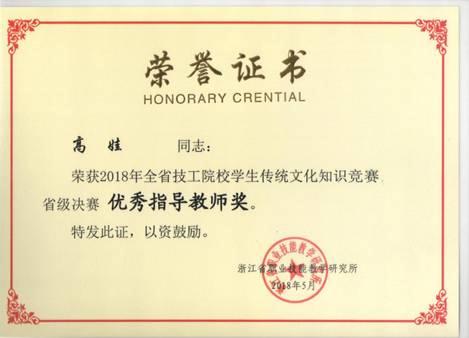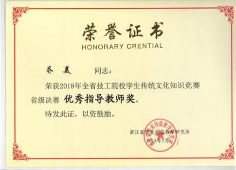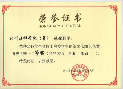 5月24日,2018年浙江省技工院校学生传统文化知识竞赛省级决赛在绍兴技师学院(筹)圆满落下帷幕,主办方浙江省职业技能教研所所长俞翟亲自参加颁奖典礼。本次赛事共有44支学校代表队、130余名学生参加,台州技师学院(筹)姚健荣获一等奖,指导老师乔美、高娃荣获优秀指导教师奖。