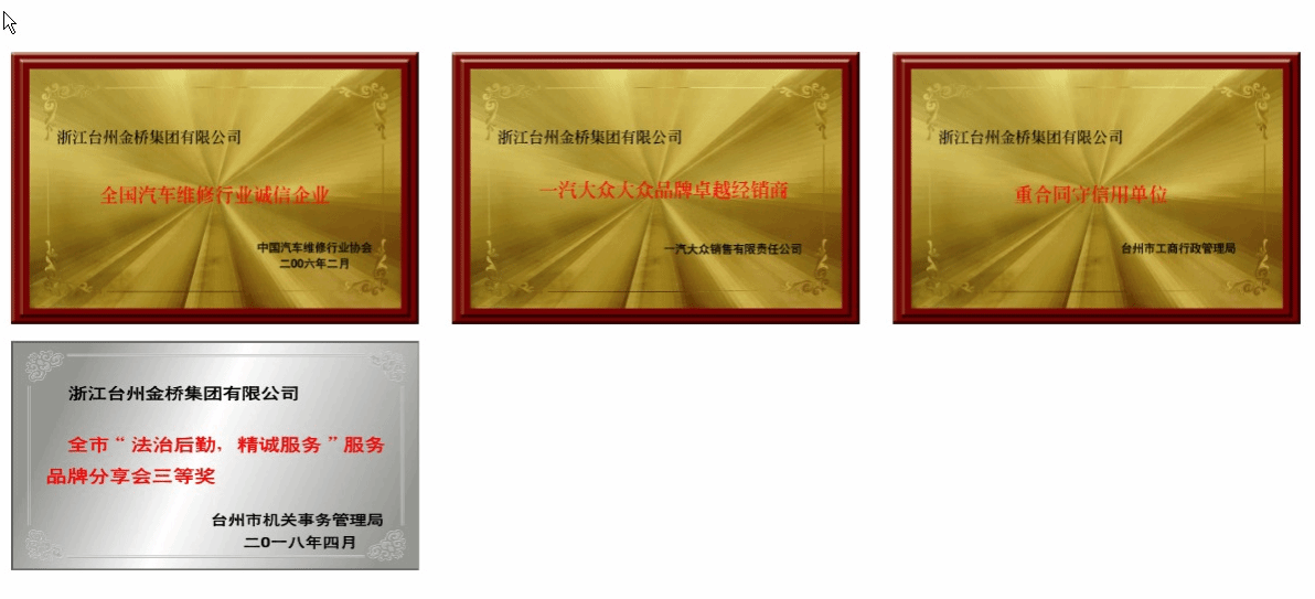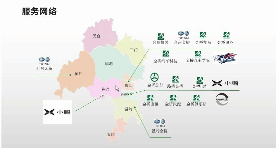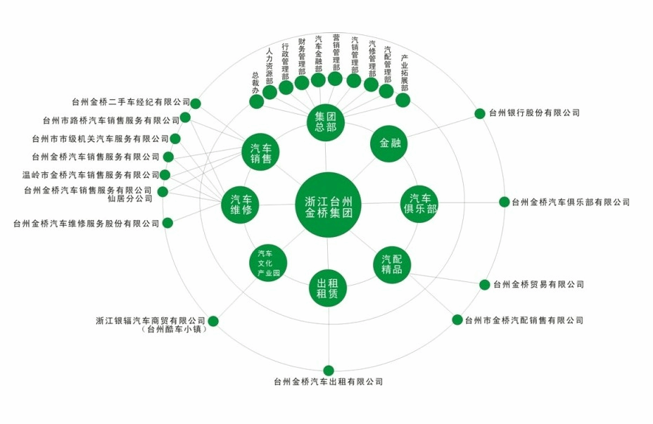 除投资台州银行、参与创办混合所有制汽车工程学院外,目前在上海、珠海、台州本地设有20多家子公司,员工800多人,营业面积超20万平方米,年营业额突破6亿,总资产超8亿。集团建有多家一汽-大众大众品牌授权4S店,一汽-大众品牌认证二手车销售中心,小鹏智能电动汽车授权体验、交付、服务中心,理想智能电动汽车授权钣喷中心,中高档轿车专修店以及台州酷车小镇汽车文化创意产业园,台州云谷跨境电商孵化园,享道出行授权运营中心,金桥客运出租车运营中心,金桥汽车救援服务中心等,为客户持续提供“购车、用车、养车、玩车”系列优质服务。