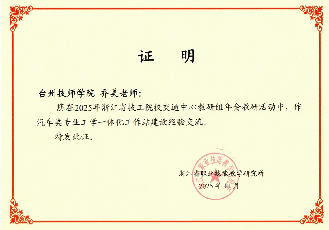 近日,浙江省技工院校交通中心教研组年会隆重召开,来自全省各地的交通类技工院校代表齐聚一堂,共话工学一体化教学改革新路径、共探交通职业教育高质量发展新方向。我院交通技师学院作为台州交通职教领域的骨干力量,由院长乔美携优质教学成果参会,深度参与年会各项议程。