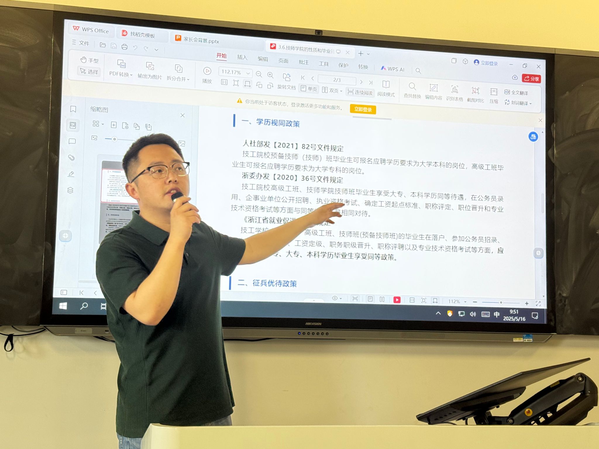 家长会于上午9:30准时开始,家长们提前15分钟签到入场。会议伊始,学院副书记强调了家校合作在学生成长中的重要性。随后,建筑工程学院院长李登详细介绍了专业建设、学生日常管理等情况,帮助家长全面了解学院的教育理念和办学特色:新国标实施背景下,台州技师学院建筑工程学院以"智能建造"为特色方向,深化产教融合,为建筑行业转型升级培养高素质技术技能人才。学院依托国家级高技能人才培训基地优势,构建了"专业链对接产业链"的特色育人体系,成为区域建筑业发展的生力军。