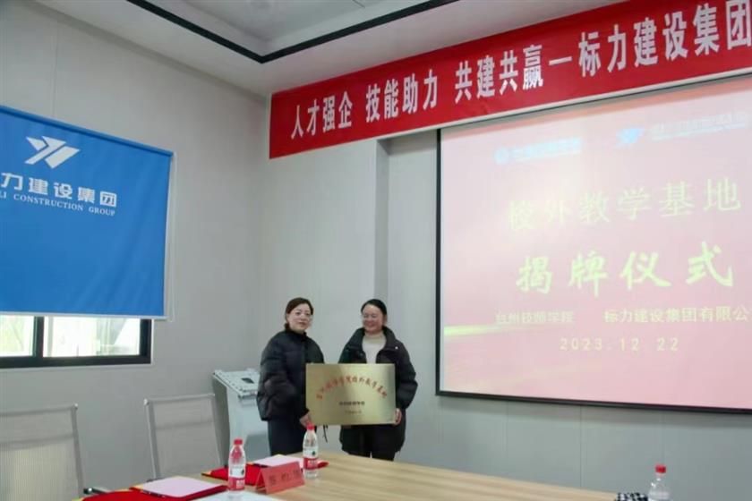 12月22日,台州技师学院第三党支部、建筑工程学院师生赴标力建设集团有限公司开展校企共建活动。学院纪委书记曹云,标力建设集团陈宝弟、张文莉、李英英等领导出席活动。双方在原有校企合作的基础上,以党建引领,进行“多维度、战略性、全面性”深度校企合作,并完成“校企党建共建基地”、“校外教学实践基地”、“创新创业教育基地”三大基地授牌及签约仪式。