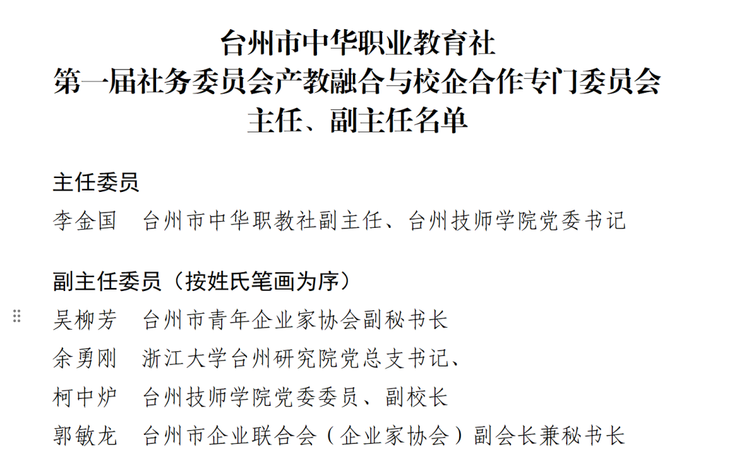 中共台州市委统战部副部长、台州市中华职教社常务副主任於海雅在会上宣读了产教融合专委会第一届成员名单。会议审议并通过了《台州市中华职业教育社产教融合与校企合作专门委员会工作细则》,为专委会今后规范运行和高效履职奠定了制度基础。